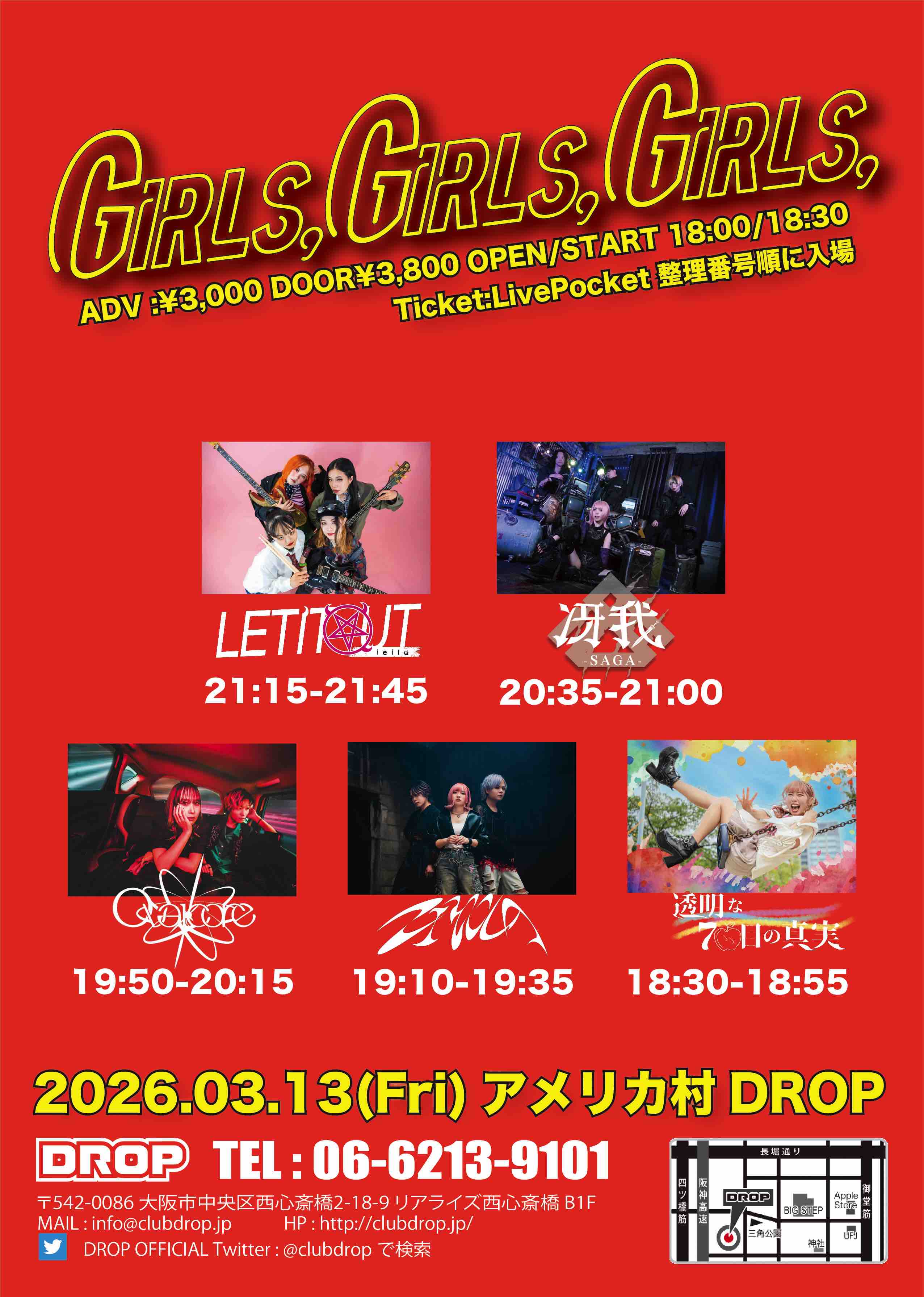 アメリカ村 DROP(ドロップ) スケジュール 2026.3.13(Fri) Girls,Girls,Girls, [ACT] LETITOUT-lelia- / 冴我 / ZIYOLA / Ovalcore / 透明な7日目の真実 [OPEN/START] 18:00/18:30 [料金] ADV/DOOR ¥3,000/¥3,800(入場時別途1D代金¥700-必要)※02/16 20:00チケット発売開始 LivePocket:https://livepocket.jp/e/973tt 入場順:整理番号順 (問)アメリカ村DROP 06-6213-9101