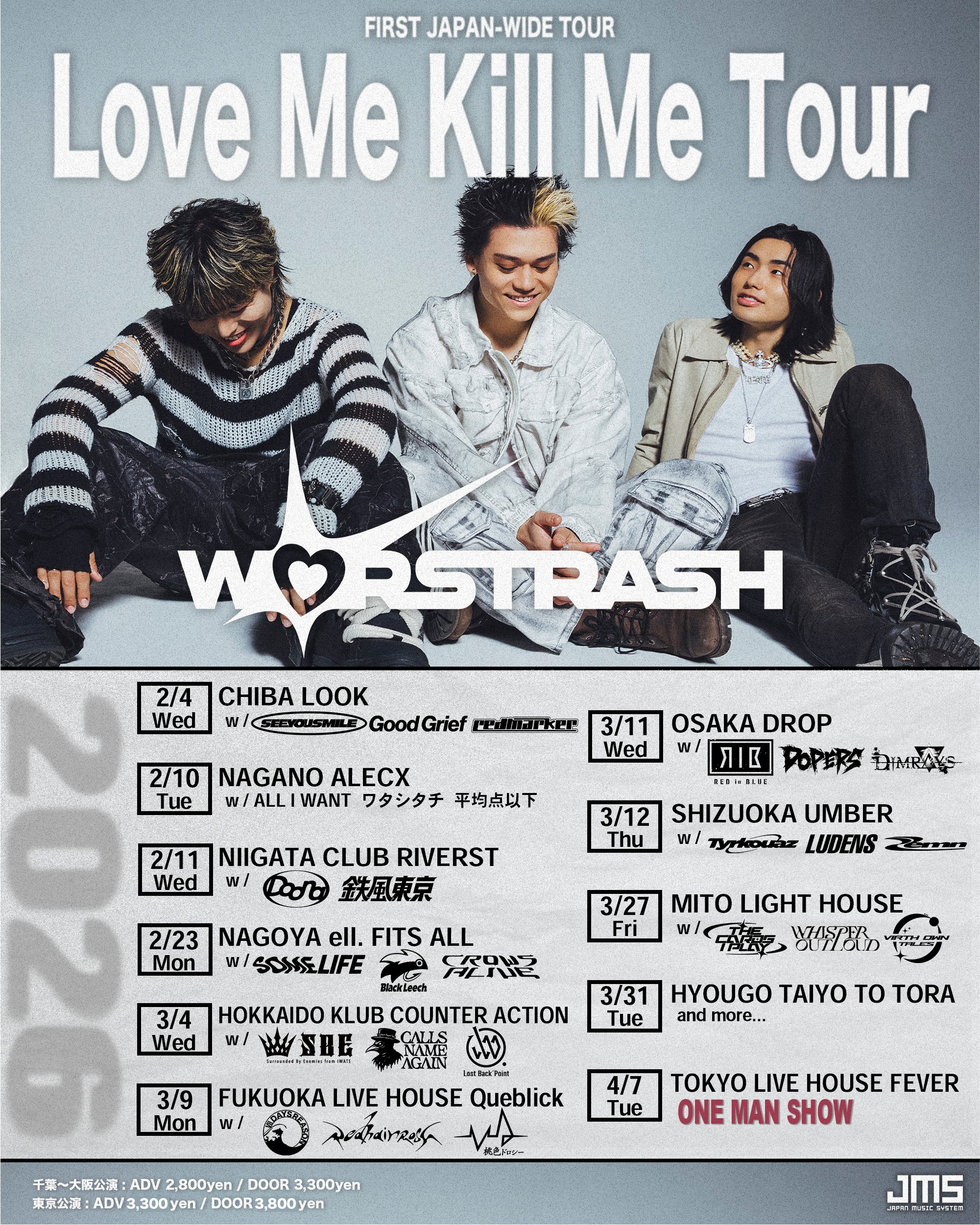 アメリカ村 DROP(ドロップ) スケジュール 2026.3.11(Wed) Love Me Kill Me Tour [ACT] WORSTRASH / RED in BLUE / DOPERS / Dimrays [OPEN/START] 18:30/19:00 [料金] ADV/DOOR ¥2,800/¥--(入場時別途1D代金¥700-必要) □企画・制作:JMS/H.I.P. (問)キョードーインフォメーション 0570-200-888