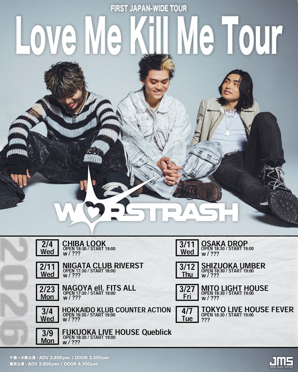 アメリカ村 DROP(ドロップ) スケジュール 2026.3.11(Wed) Love Me Kill Me Tour [ACT] WORSTRASH andmore!! [OPEN/START] 18:30/19:00 [料金] ADV/DOOR ¥2,800/¥--(入場時別途1D代金¥700-必要) □企画・制作:JMS/H.I.P. (問)キョードーインフォメーション 0570-200-888
