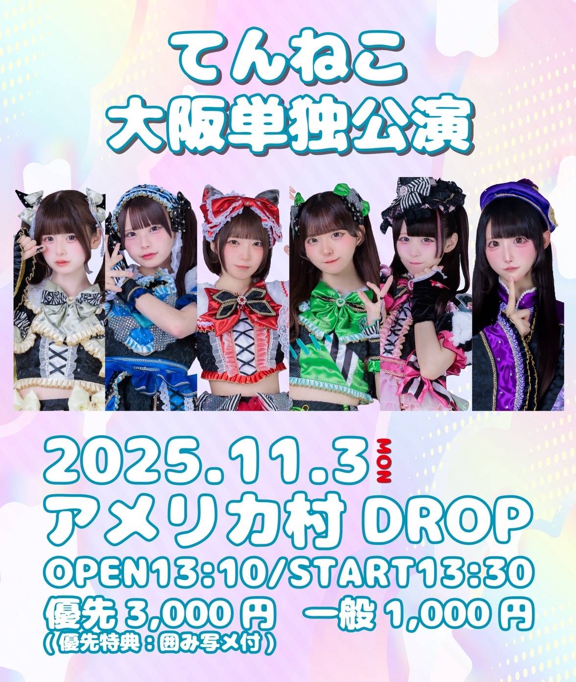 アメリカ村 DROP(ドロップ) スケジュール 2025.11.03(Mon) 『てんねこ大阪単独公演』 [ACT] 逆転ねこぱんちっ! [OPEN/START] 13:10/13:30 [料金] 優先エリア3,000円 一般1,000円(各+D) 優先特典:囲み写メ チケット 10/29(水) 22:30~ https://tiget.net/events/439887