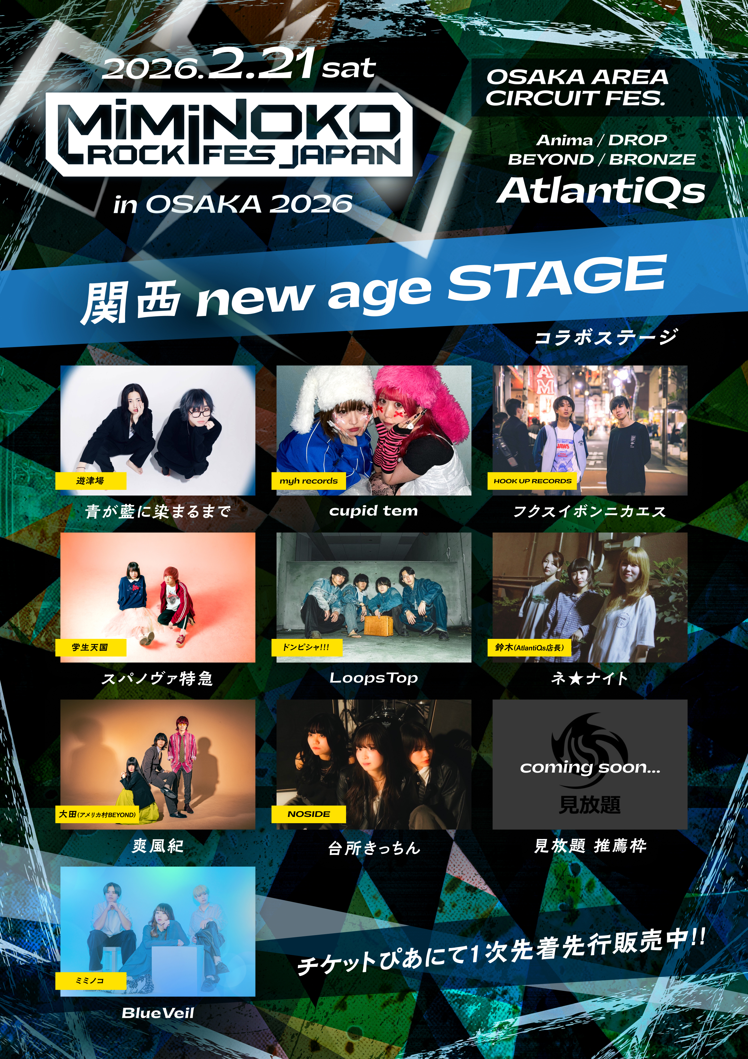 - 【第1弾出演アーティスト】 つきみ / ウマシカて / komsume / レトロマイガール!! / 秘めごと / ORCALAND Viewtrade / ハイドアウト / メルトタイマー / Daisycall 【第2弾出演アーティスト】チセツナガラ / パキルカ / Alaska Jam / UtaKata / tonerico / CozyLand / OKOJO / イロムク 【第3弾出演アーティスト】ちゃくら / 終活クラブ / EVE OF THE LAIN / 606号室 / 至福ぽんちょ / COPES / 【第4弾出演アーティスト】<関西NEW AGE stage> 青が藍に染まるまで / cupid tem / フクスイボンニカエス / スパノヴァ特急 / LoopsTop / ネ★ナイト / 爽風紀 / 台所きっちん / BlueVeil / and more...