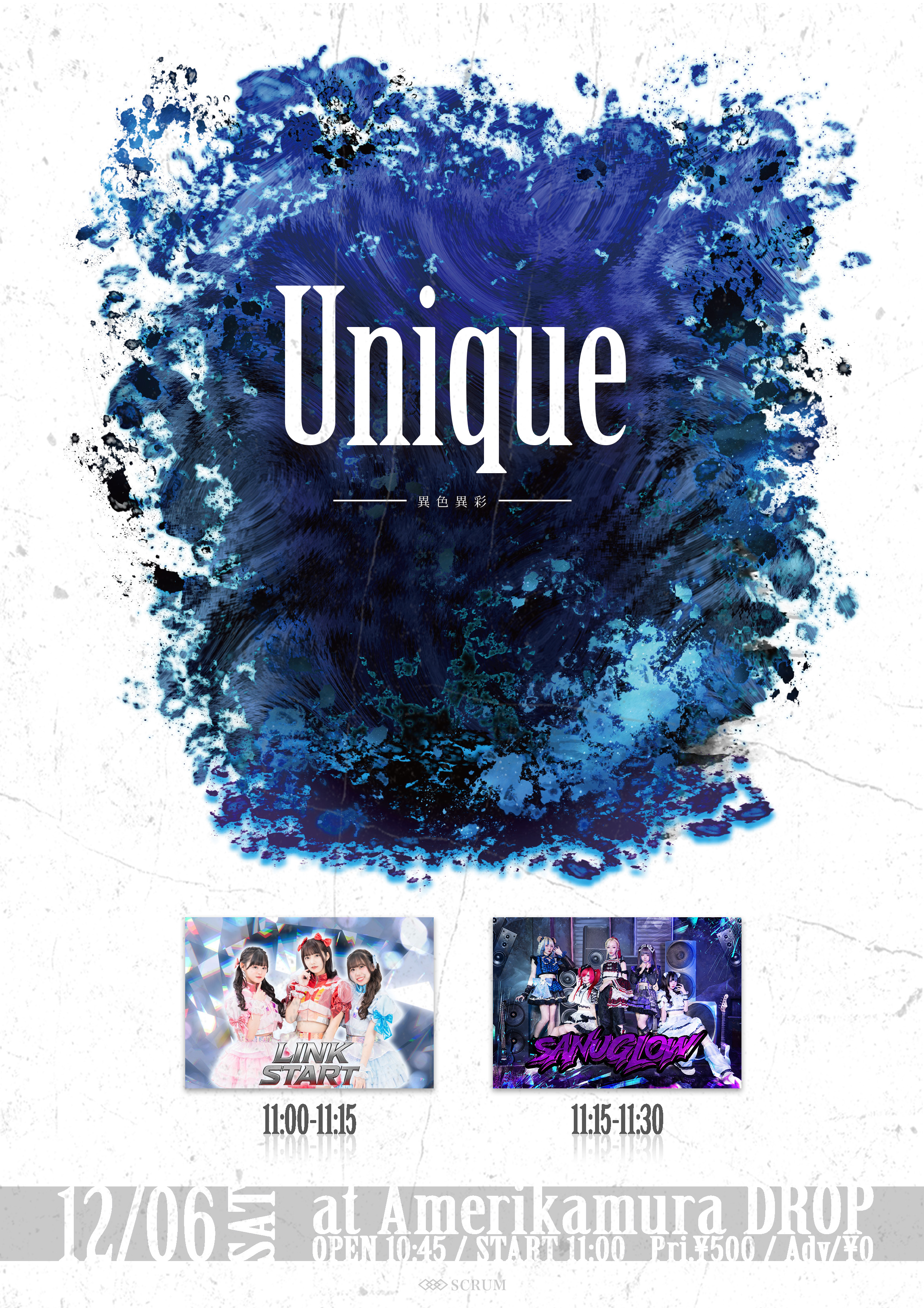 アメリカ村 DROP(ドロップ) スケジュール 2025.12.06(Sat) Unique [ACT] SANUGLOW / link start [OPEN/START] 10:45/11:00 [料金] 優先 ¥500 / 一般 ¥0 (+1D) 【予約】 https://t-dv.com/UniqueEvent2025 →11/24 22:30〜 12/06 23:59
