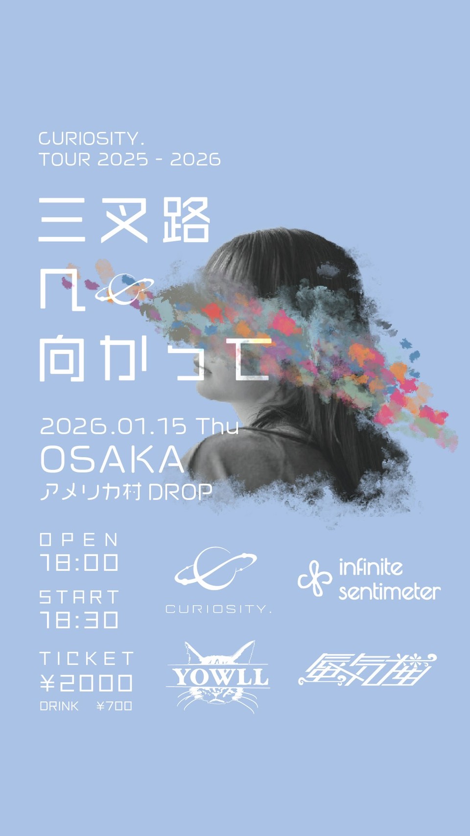アメリカ村 DROP(ドロップ) スケジュール 2026.1.15(Thu) CURIOSITY. TOUR 2025-2026 「三叉路へ向かって」 [ACT] CURIOSITY./YOWLL/infinite sentimeter/蜃気楼 [OPEN/START] 18:00/18:30 [料金] ADV/DOOR ¥2000/¥2500(入場時別途1D代金¥700-必要) (問)アメリカ村DROP 06-6213-9101