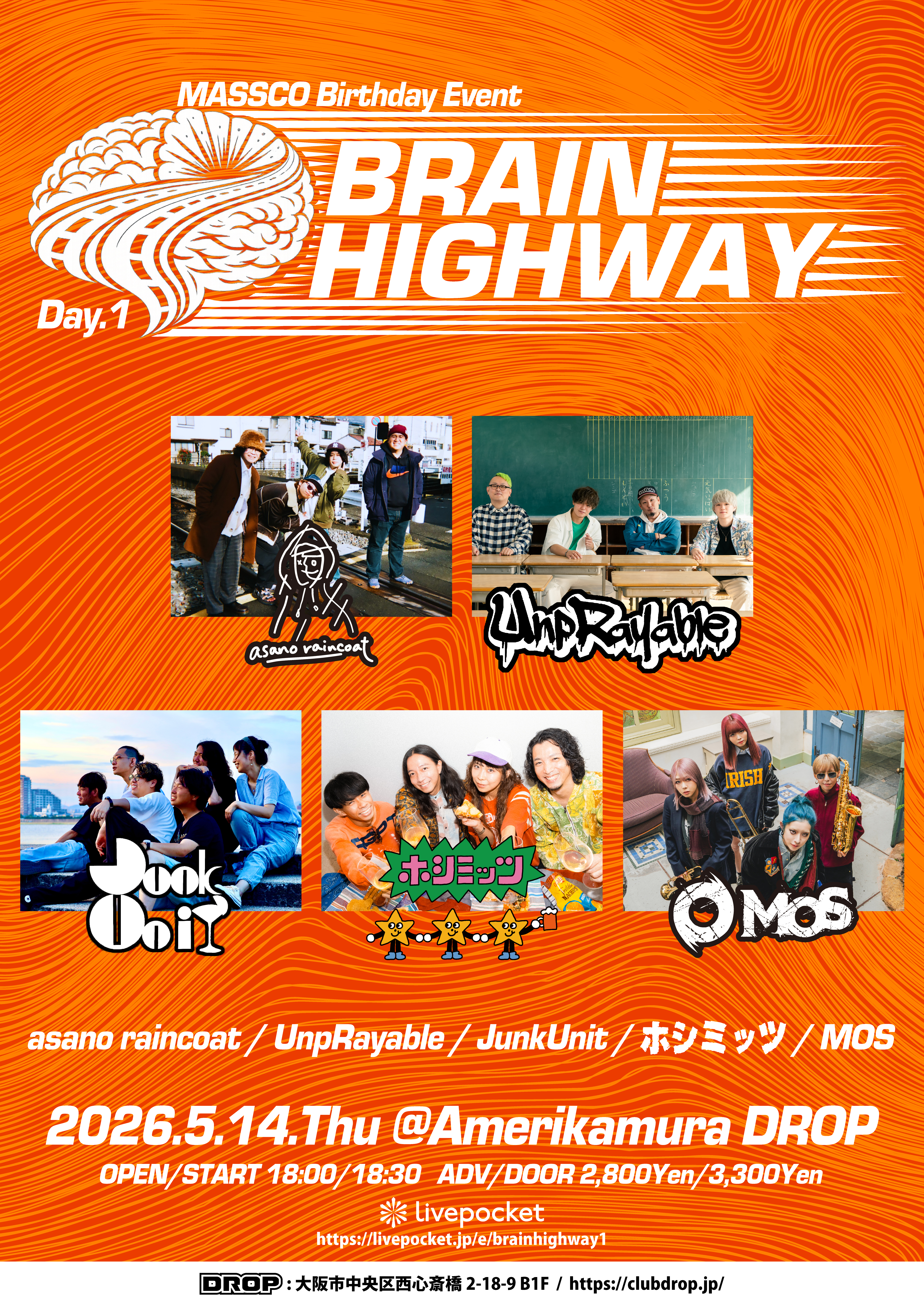 アメリカ村 DROP(ドロップ) スケジュール 2026.5.14(Thu) BRAIN HIGHWAY Day.1 [ACT] asano raincoat / UnpRayable / JunkUnit / ホシミッツ / MOS [OPEN/START] 18:00/18:30 [料金] ADV/DOOR ¥2,800-/¥3,300-(入場時別途1D代金¥700-必要) LivePocket https://livepocket.jp/e/brainhighway1/ (問)アメリカ村DROP 06-6213-9101