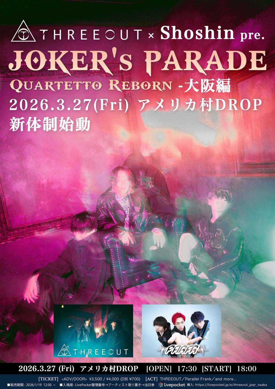 アメリカ村 DROP(ドロップ) スケジュール 2026.3.27(Fri) THREEOUT×しょーしん pre. 「JOKER'S PARADE-Quartetto Reborn-大阪編」 [ACT] THREEOUT / Parallel Frank / and more.. [OPEN/START] 17:30/18:00(予定) [料金] ADV/DOOR ¥3,500/¥4,000(入場時別途1D代金¥700-必要) チケット販売ページ https://livepocket.jp/e/threeout_jpqr_osaka (問)アメリカ村DROP 06-6213-9101