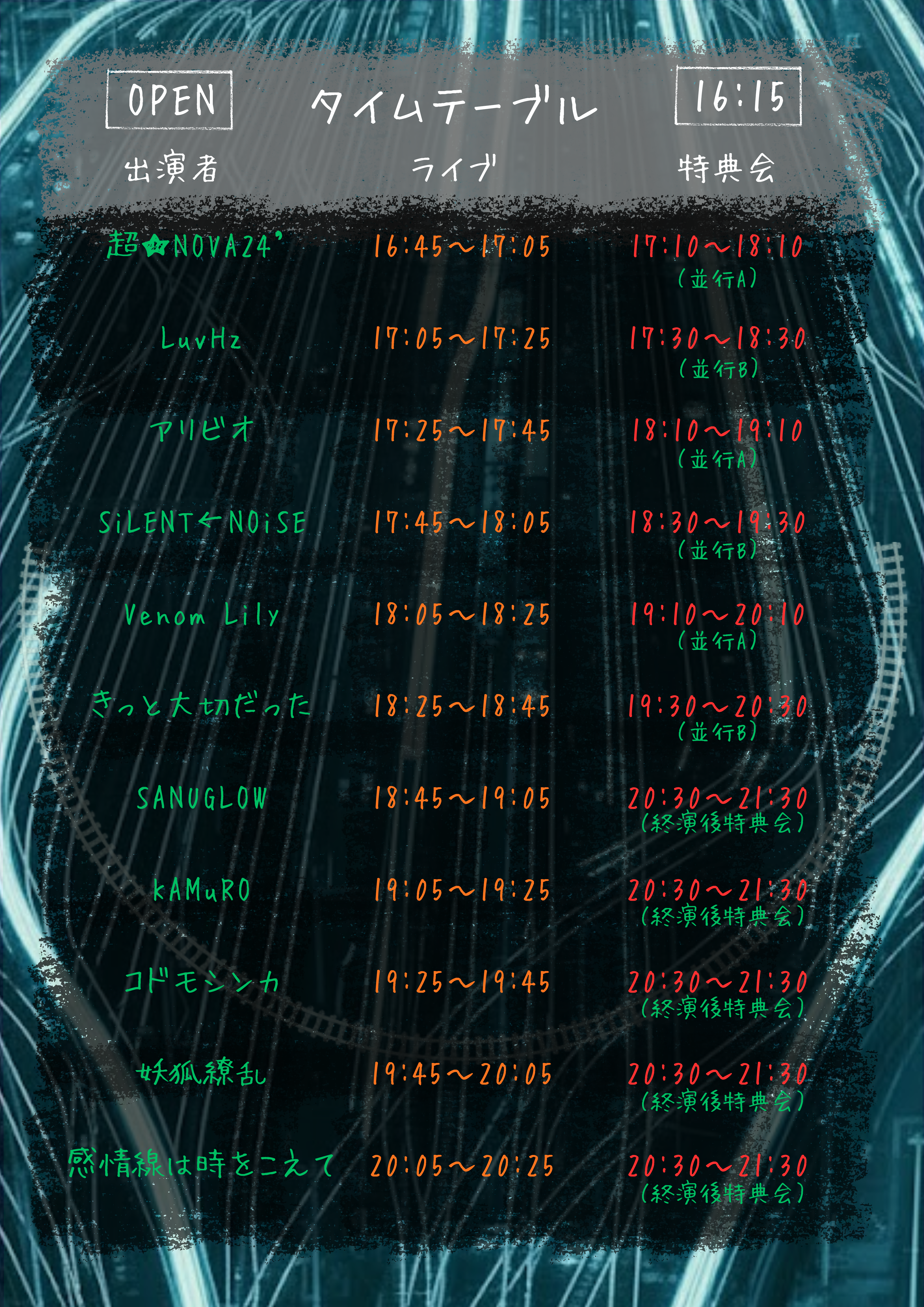 - アリビオ / 感情線は時をこえて / KAMuRO / きっと大切だった / コドモシンカ / SiLENT←NOiSE / SANUGLOW / 超★NOVA24’ / Venom Lily / 妖狐繚乱 / LuvHuz