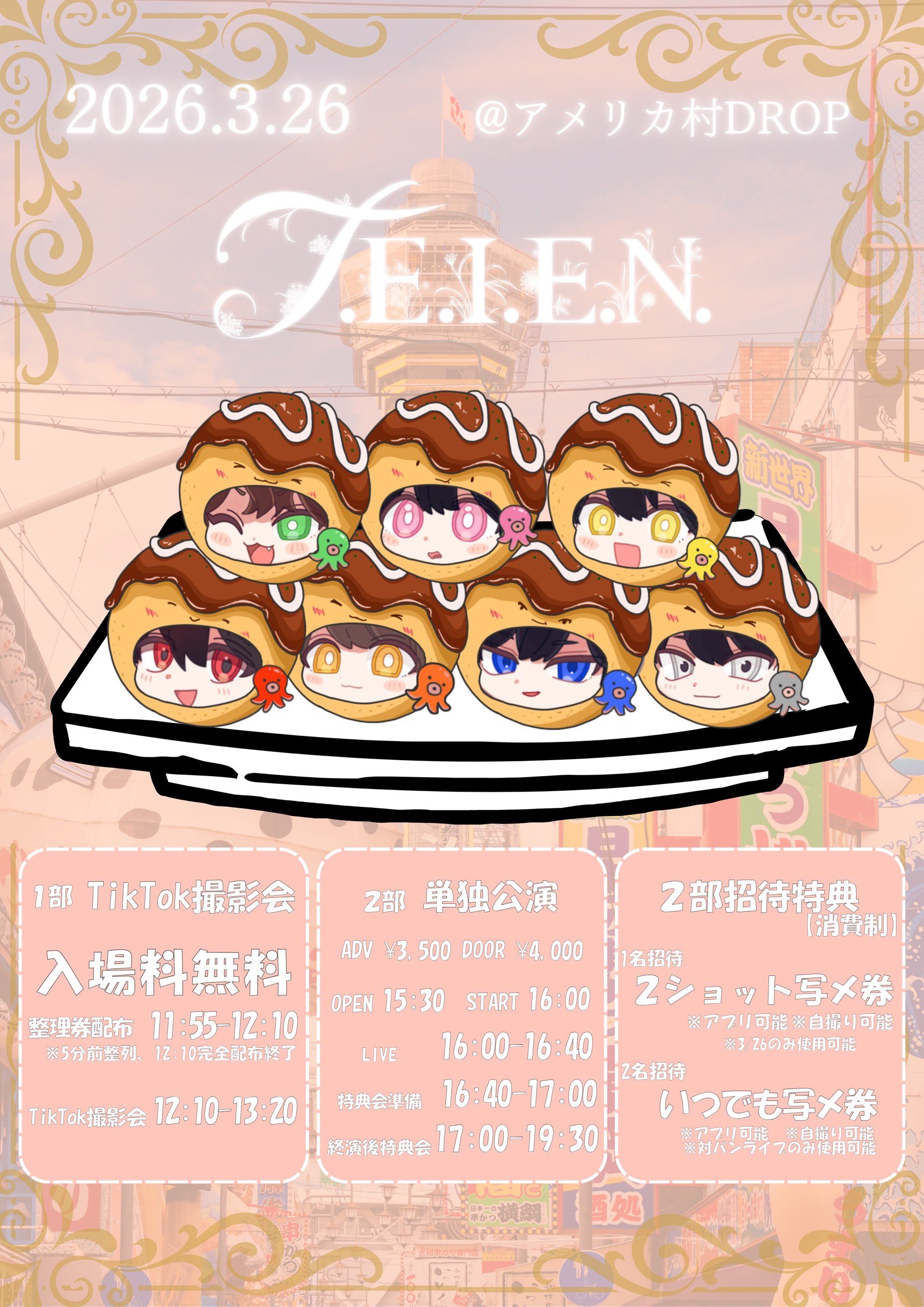 アメリカ村 DROP(ドロップ) スケジュール 2026.3.26(Thu) T.E.I.E.N. ~大阪編~ [ACT] バトラブ! [OPEN/START] 15:30/16:00 [料金] ADV/DOOR ¥3,500/¥4,000-(入場時別途1D代金¥700-必要) (問)アメリカ村DROP 06-6213-9101
