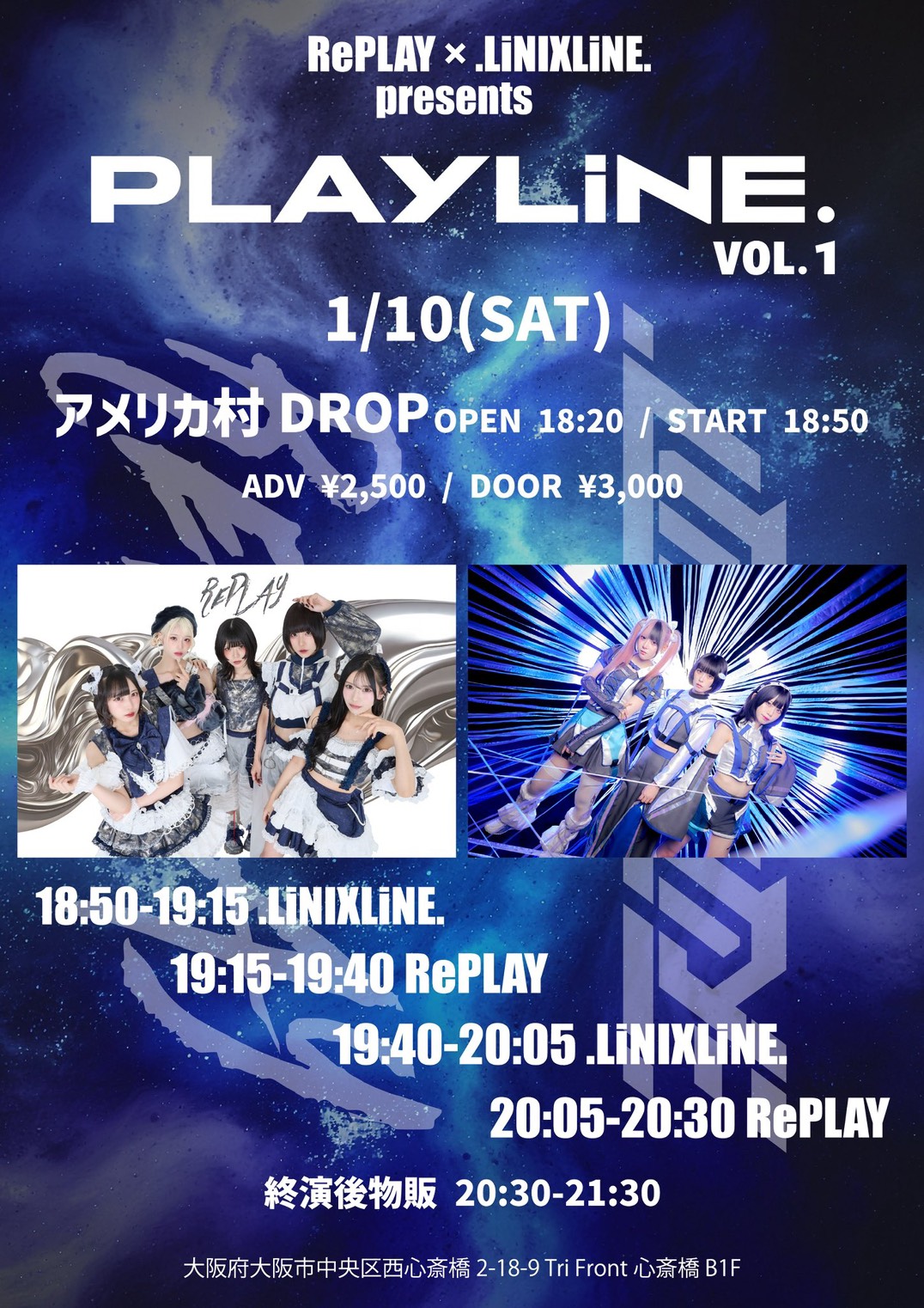 アメリカ村 DROP(ドロップ) スケジュール 2026.1.10(Sat) RePLAY&.LiNIXLiNE. presents 『PLAYLiNE.』 [ACT] RePLAY / .LiNIXLiNE. [OPEN/START] 18:20 / 18:50 [料金] ADV/DOOR ¥2,500/¥3,000(入場時別途1D代金¥700-必要) ▼TIGET https://tiget.net/events/451374 (問)アメリカ村DROP 06-6213-9101