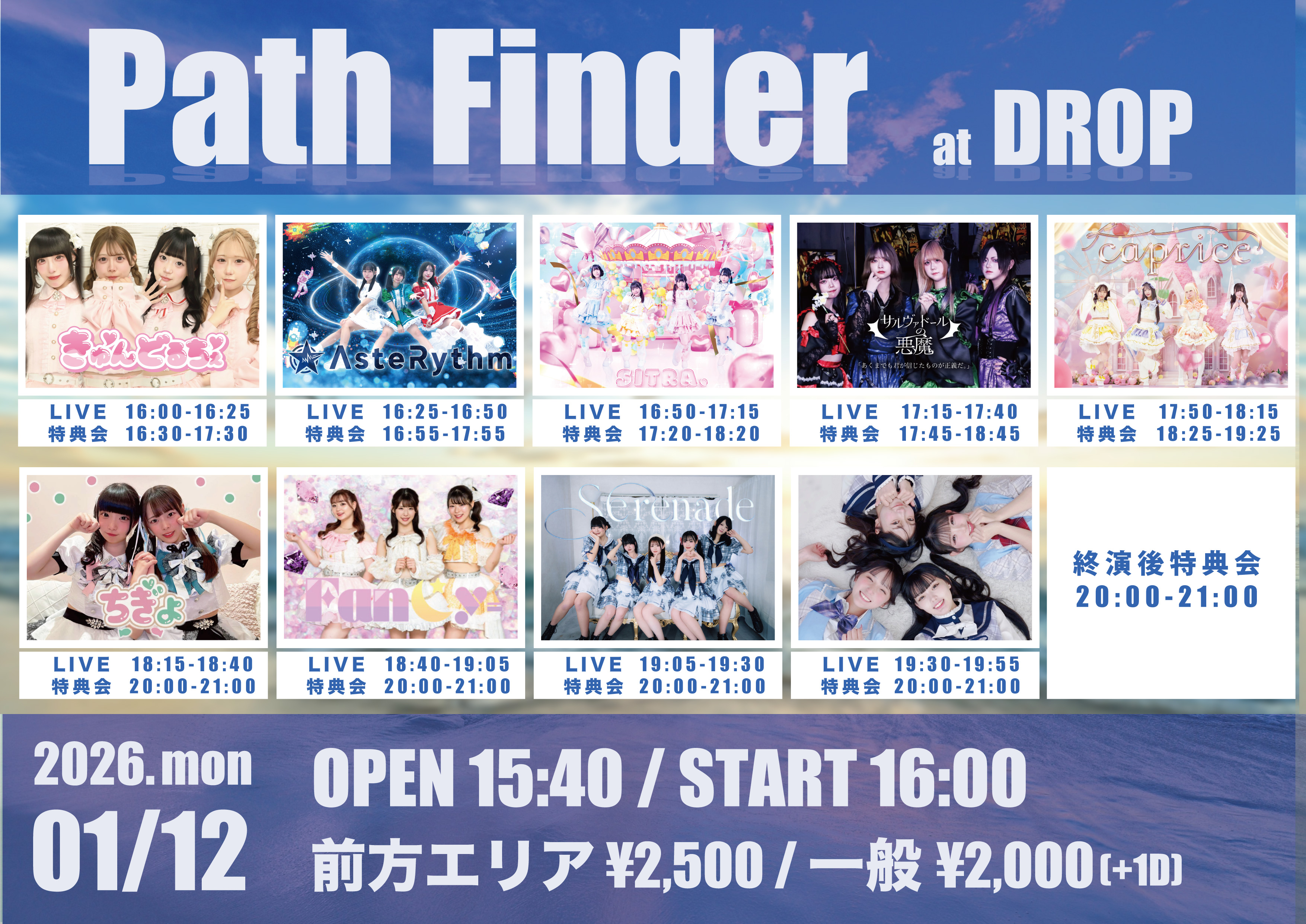 アメリカ村 DROP(ドロップ) スケジュール 2026.1.12(Mon) Path Finder [ACT] SITRA. / caprice / AsteRythm / ちぎょ / &youth! / Serenade / きゅんどるちぇ / サルヴァドールの悪魔 / FanCy- [OPEN/START] 15:40/16:00 [料金] 前方2,500円 / 一般2,000円(入場時別途1D代金¥700-必要) 16:00-16:25 きゅんどるちぇ 並行1 16:25-16:50 AsteRythm 並行2 16:50-17:15 SITRA. 並行3 17:15-17:40 サルヴァドールの悪魔 並行1 17:40-17:50 時間調整 17:50-18:15 caprice 並行2 18:15-18:40 ちぎょ 18:40-19:05 FanCy- 19:05-19:30 Serenade 19:30-19:55 &youth! 20:00-21:00 終演後 特典会 (問)アメリカ村DROP 06-6213-9101