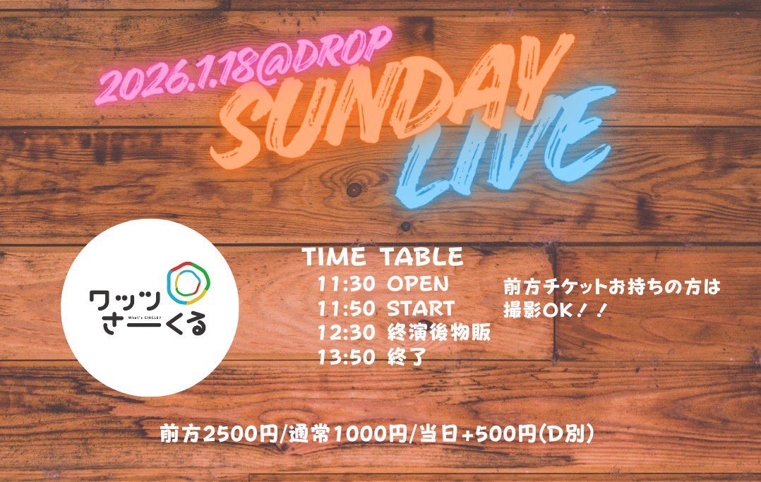 アメリカ村 DROP(ドロップ) スケジュール 2026.1.18(Sun) 「ワッツ◎さーくる 単独公演」 [ACT] ワッツ◎さーくる [OPEN/START] 11:30/11:50 [料金] 前方2500円/通常1000円/当日+500円 https://t.co/ZEbLqXpUx7 ▼ 入場順 ①前方チケット整理番号順②通常チケット整理番号順③当日券