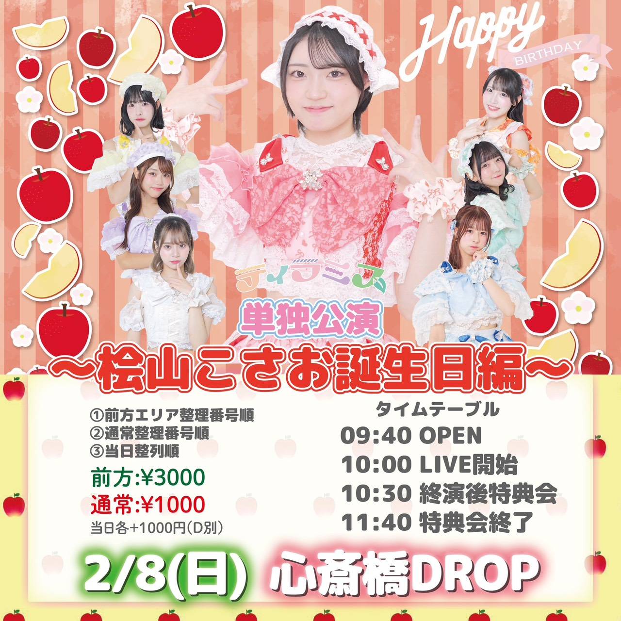 アメリカ村 DROP(ドロップ) スケジュール 2026.2.08(Sun) 『ティラミス単独公演〜桧山こさお誕生日編』 [ACT] ティラミス [OPEN/START] 9:40/10:00 [料金] 前方3000円 / 通常1000円 / 当日+1000円(別途1D代700円必須) 【2/2、22:00~発売!】 https://t.co/GcbtXqKhGT 入場順:①前方整理番号順②通常整理番号順③当日整列順 (問)アメリカ村DROP 06-6213-9101
