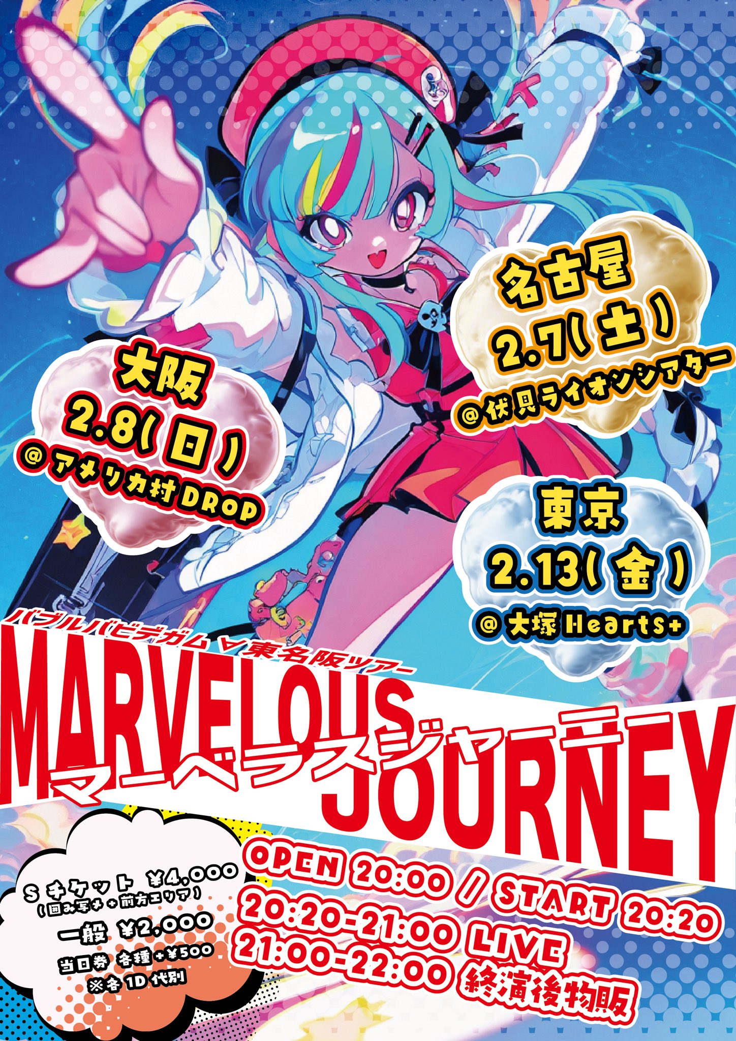 アメリカ村 DROP(ドロップ) スケジュール 2026.2.08(Sun) マーベラスジャーニー [ACT] バブルバビデガム∀ [OPEN/START] 20:00/20:20 [料金] Sチケット ¥4,000 / 一般 ¥2,000 / 当日 各+¥500(入場時別途1D代金¥700-必要) (問)アメリカ村DROP 06-6213-9101