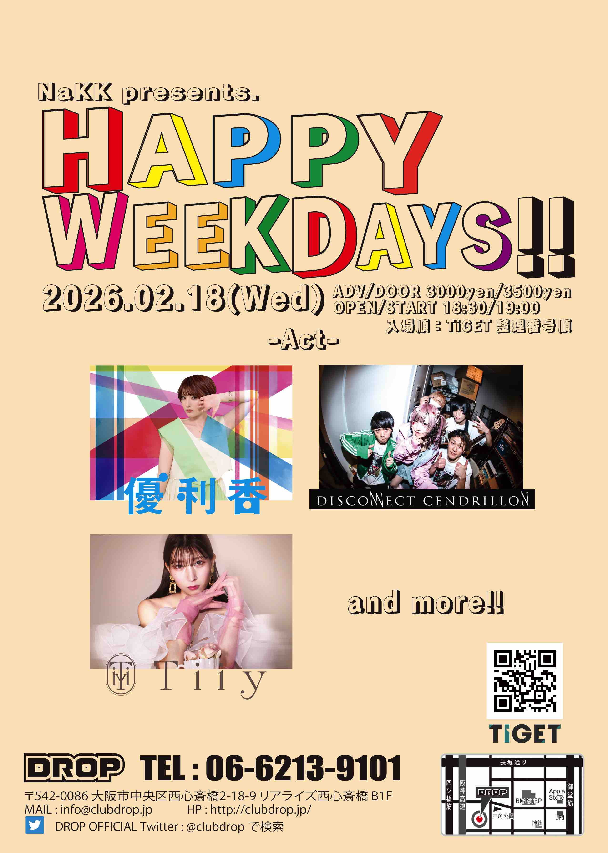 アメリカ村 DROP(ドロップ) スケジュール 2026.2.18(Wed) NaKK presents. HAPPY WEEKDAYS!! [ACT] 優利香(Band) / Disconnect Cendrillon / Tiiy / and more [OPEN/START] 18:30/19:00 [料金] ADV/DOOR ¥3,000/¥3,500(入場時別途1D代金¥700-必要) 入場順:TiGET整理番号順 TiGET予約:https://tiget.net/events/460678 ※01/21 22:00予約開始 (問)アメリカ村DROP 06-6213-9101