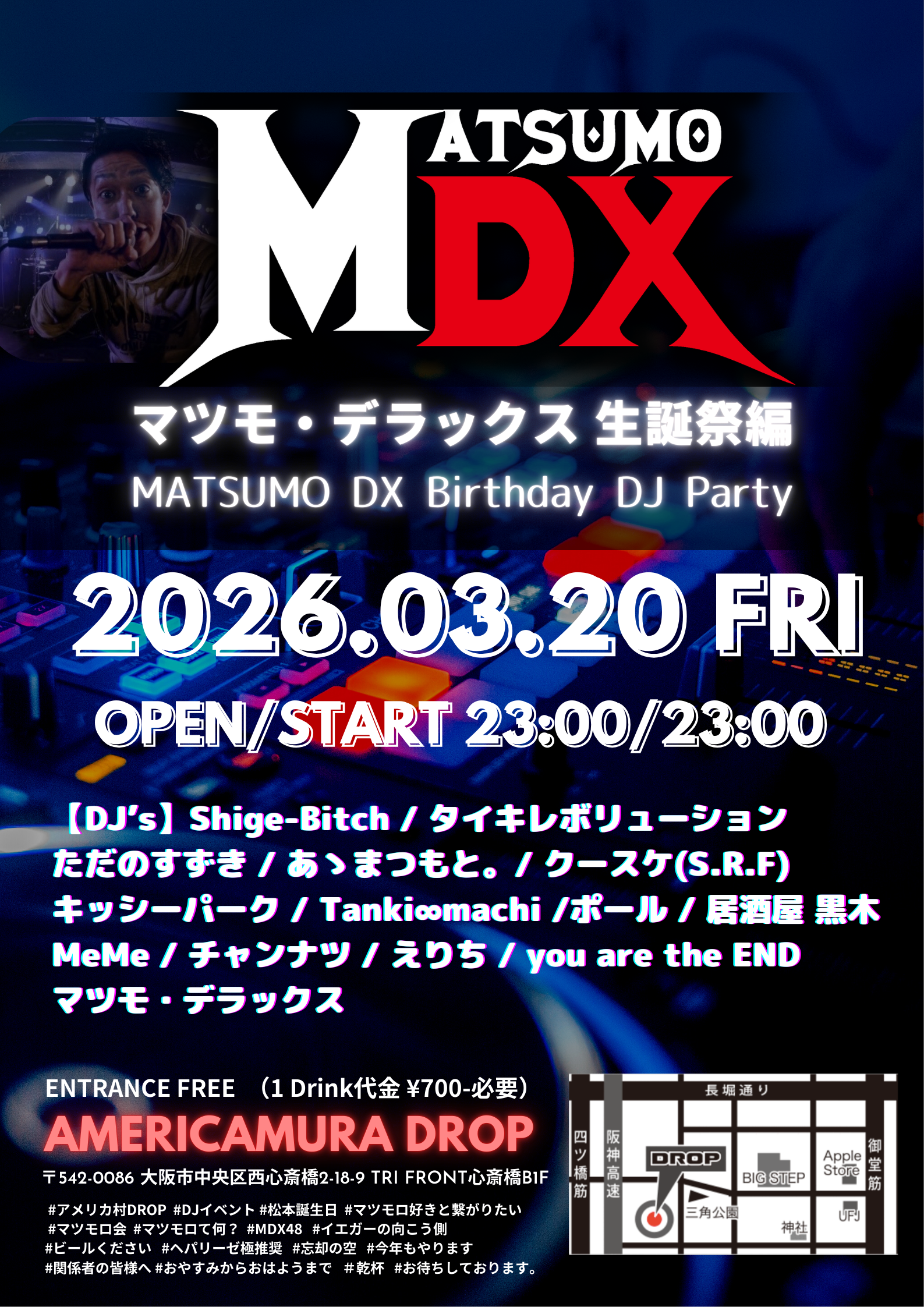アメリカ村 DROP(ドロップ) スケジュール 2026.3.20(Fri) マツモ・デラックス生誕祭編-MATSUMO DX Birthday DJ Party- [ACT] 【DJ's】Shige-Bitch / タイキレボリューション / ただのすずき / あゝまつもと。/ クースケ(S.R.F) / キッシーパーク / Tanki∞machi / ポール / 居酒屋 黒木 / MeMe / チャンナツ / えりち / you are the END / マツモ・デラックス [OPEN/START] 23:00 [料金] ENTRANCE FREE! (問)アメリカ村DROP 06-6213-9101