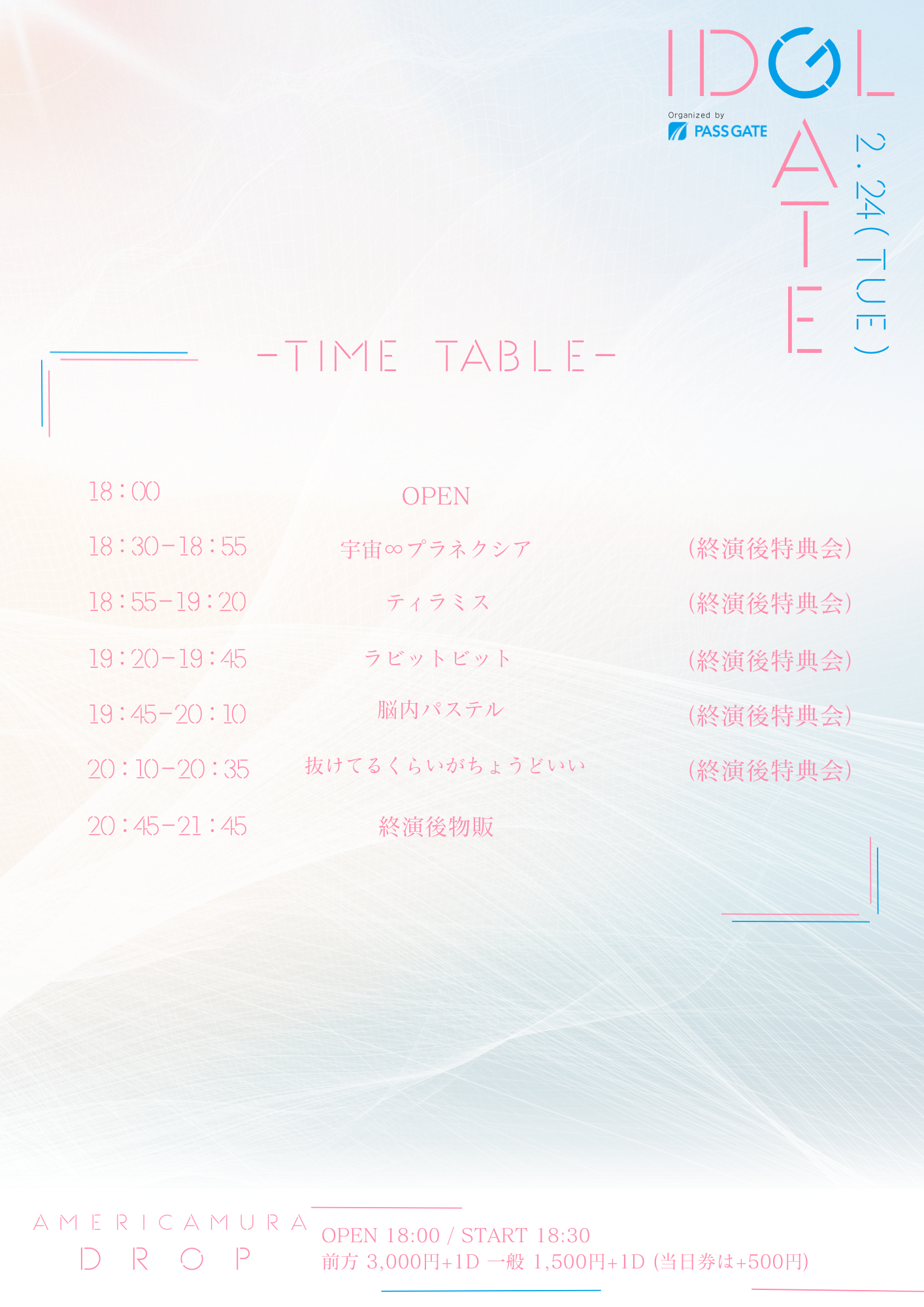 アメリカ村 DROP(ドロップ) スケジュール 2026.2.28(Sat) IDOL GATE in DROP【NIGHT】 [ACT] すべての瞬間は君だった。/ティラミス/脳内パステル/宇宙∞プラネクシア/ラビットビット [OPEN/START] 2部:OPEN 18:00 START 18:30 [料金] 前方¥3,000/一般¥1,500(各+1D) ※当日券は各+¥500 【チケットURL】https://t-dv.com/idolgate_drop_night